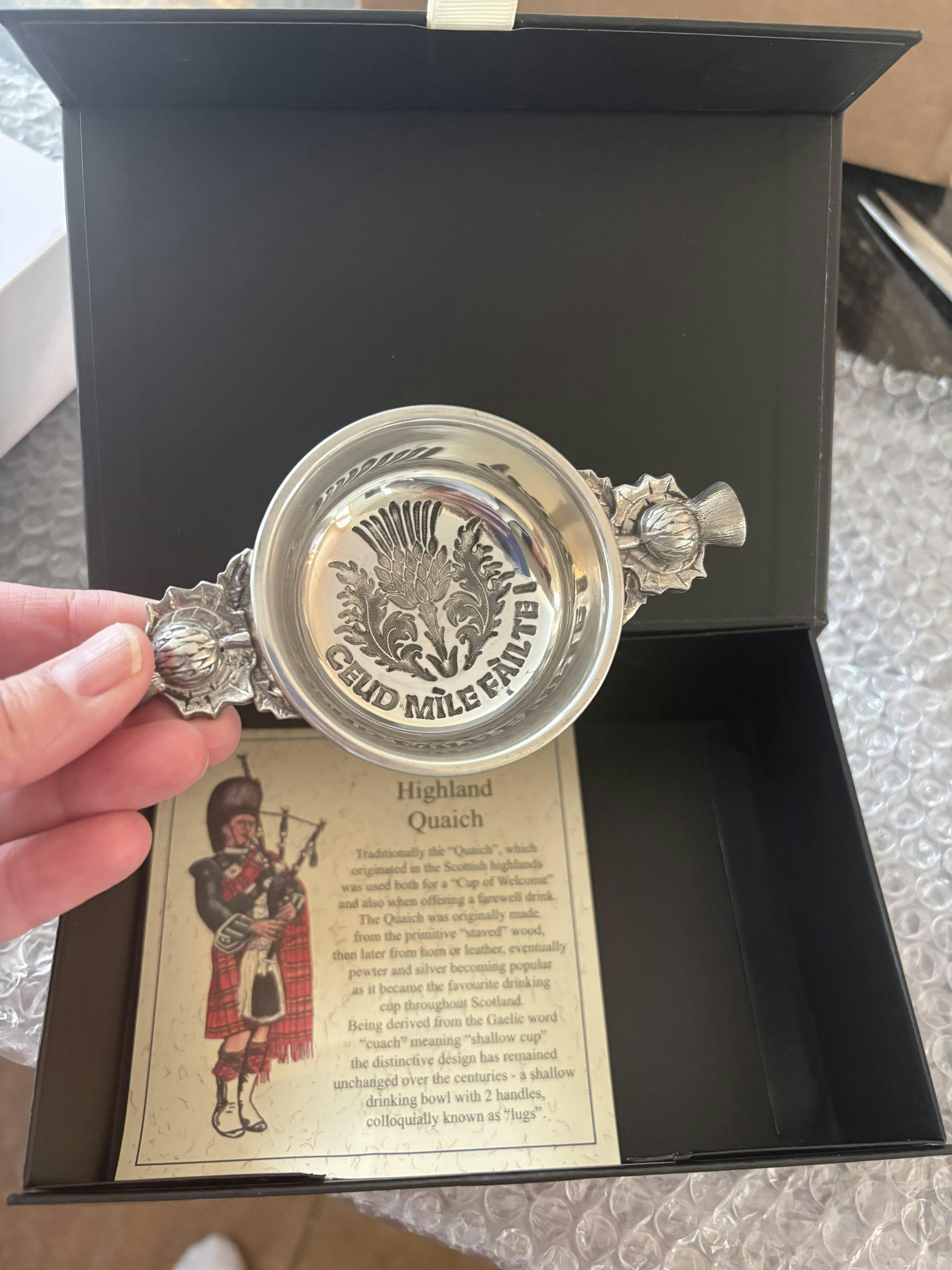 This 2.5" diameter Quaich is 1.5" tall and features a Celtic band around the otherwise highly polished bowl, and also boasts two gorgeous Scottish thistle style handles. The inside of the bowl includes an attractive Scottish thistle image together with the text 'CEUD MILE FAILTE', which translates as 'A Hundred Thousand Welcomes'. The Quaich is provided in a cream and black presentation box.