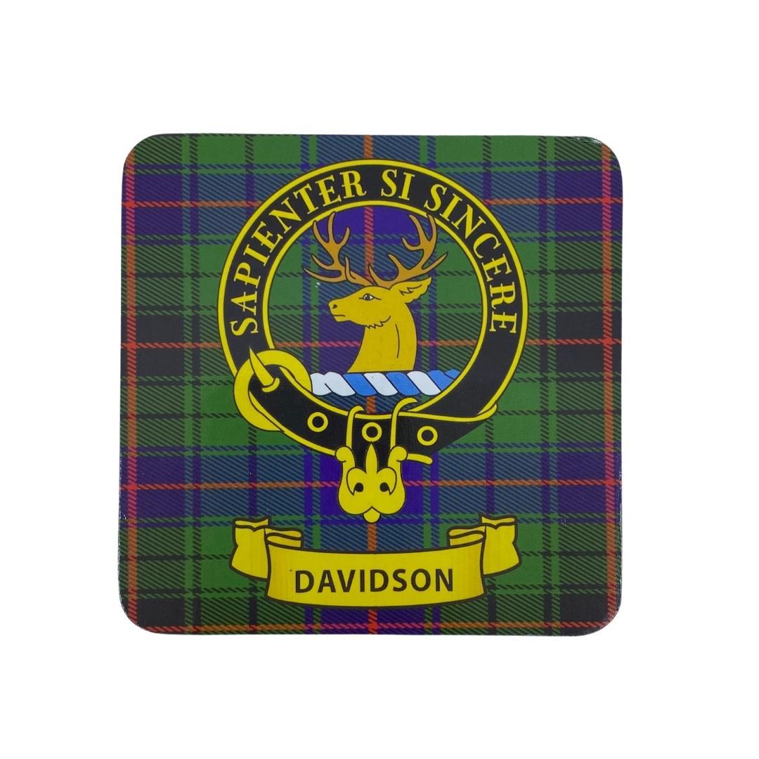 Our Davidson clan crest cork backed coasters feature a full colour crest with a full tartan background. Approximately 3 1/2” x 3 1/2”. Made in Scotland.