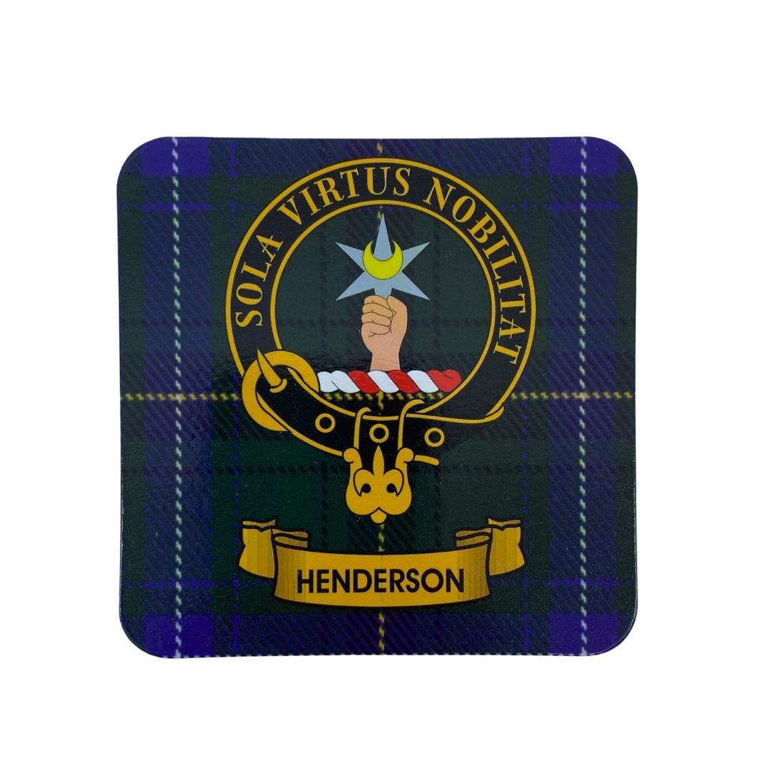 Our Henderson clan crest cork backed coasters feature a full colour crest with a full tartan background. Approximately 3 1/2” x 3 1/2”. Made in Scotland.