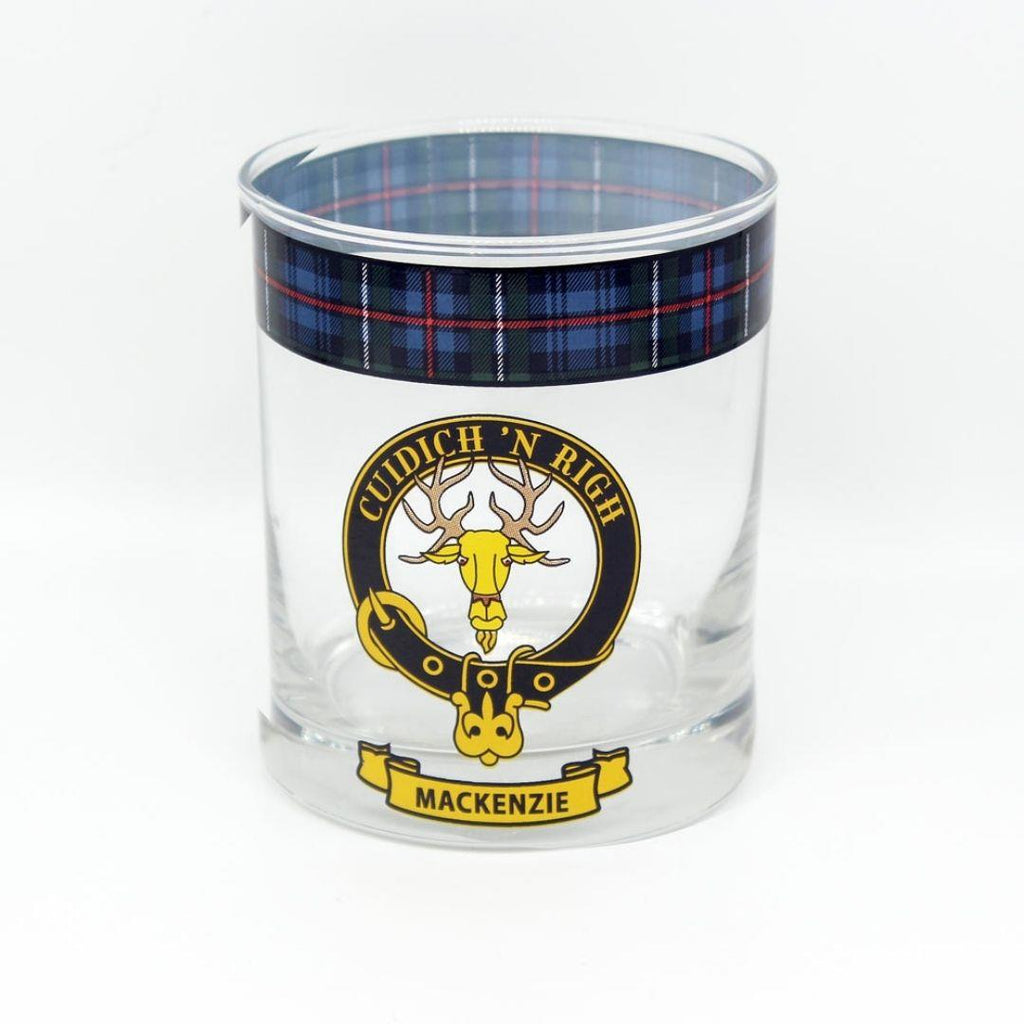 A 6oz whisky glass featuring the MacKenzie Clan Crest and Tartan around the rim. Made in Scotland.