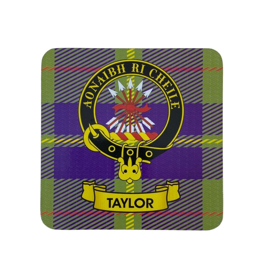Our Taylor clan crest cork backed coasters feature a full colour crest with a full tartan background. Approximately 3 1/2” x 3 1/2”. Made in Scotland.