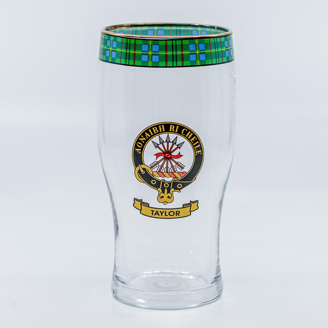 A 16oz pint / beer glass featuring the Taylor Clan Crest and Tartan around the rim. Made in Scotland.