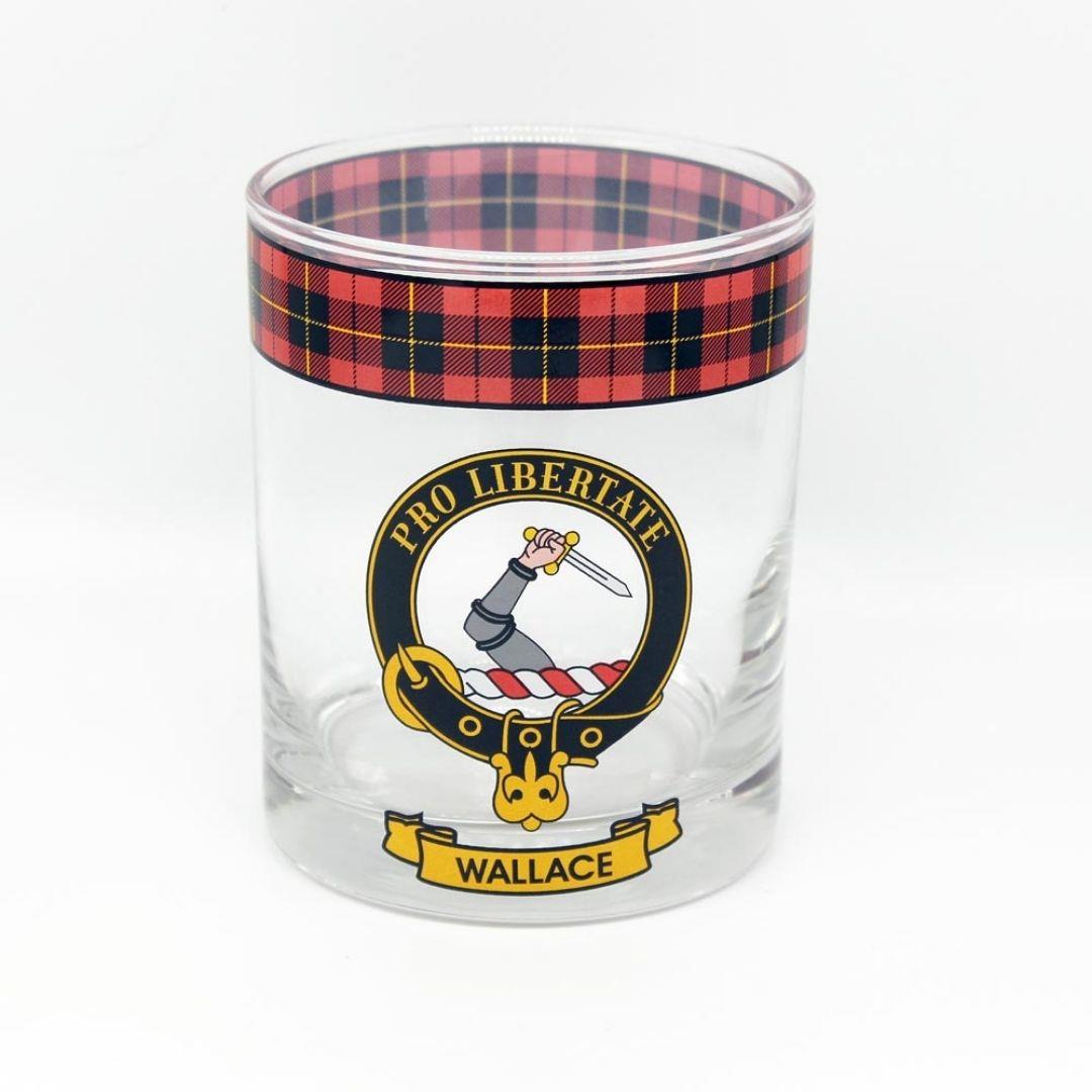 A 6oz whisky glass featuring the Wallace Clan Crest and Tartan around the rim. Made in Scotland.